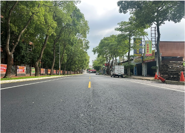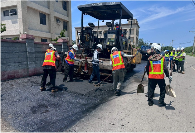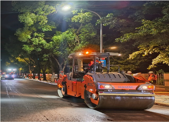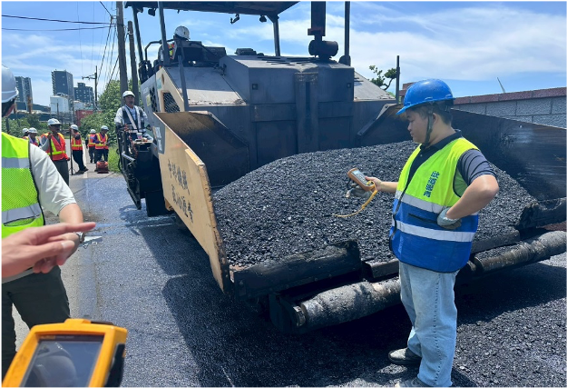 為確保路面鋪設品質與環保效益,採用「溫拌瀝青混凝土」技術進行試鋪。 相較傳統熱拌方式,溫拌技術能在較低溫度下施工,有效降低碳排放與作業人員暴露於高溫環境的風險。
