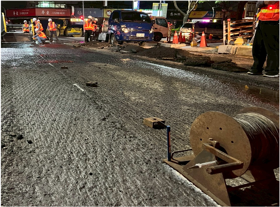 在鋪設前,透過全站儀放樣定位,確保每一道路線型、寬度與標高都與設計圖完全符合。 並採用「鋼索引導」技術輔助攤鋪機行進,有效提高鋪設精度與直線度,避免邊界蛇行或偏差現象。